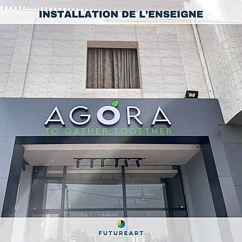 Custom illuminated lettering and professional installation for Agora venue.