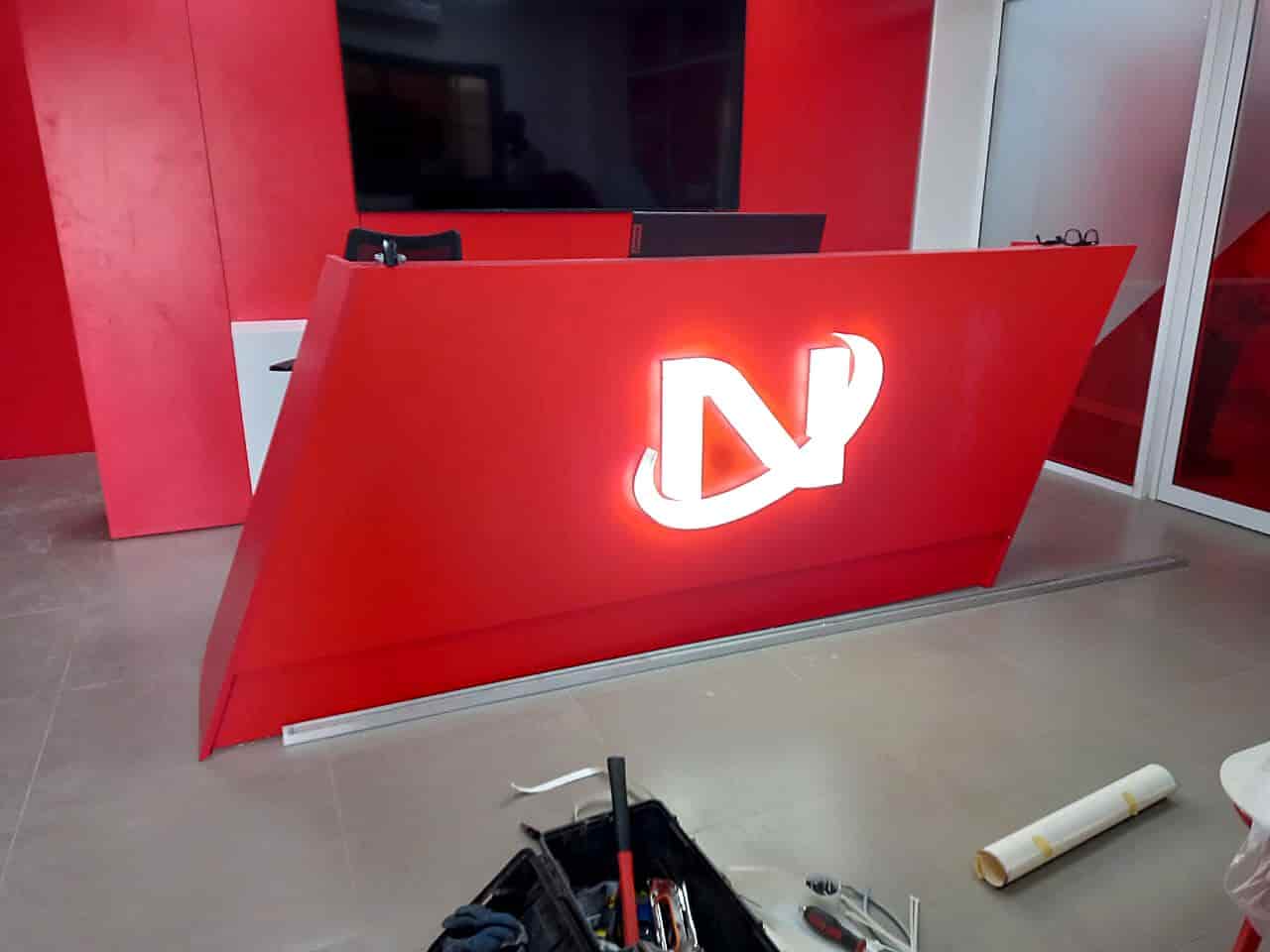 Backlit illuminated logo and reception desk branding for DN corporate office interior.
