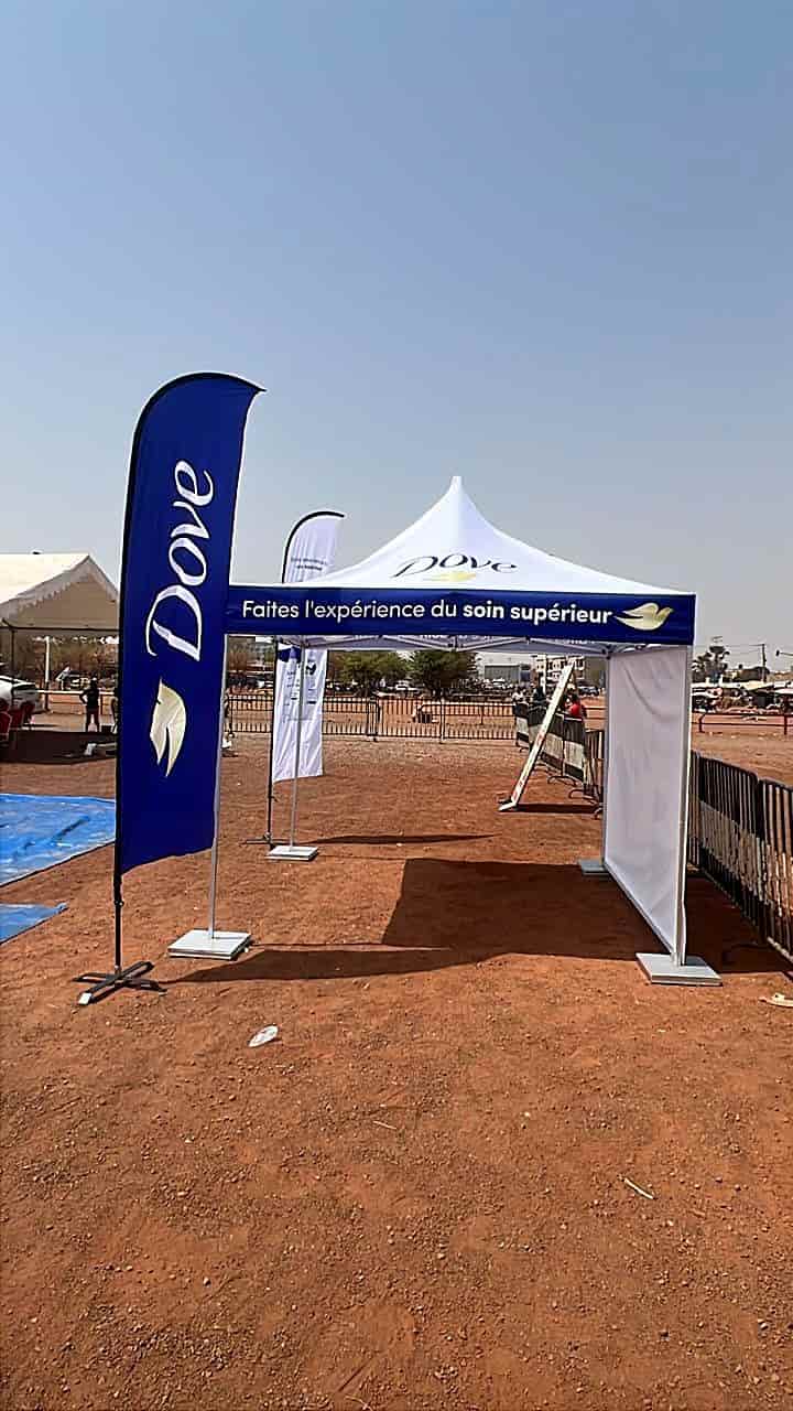 Branded pop-up tent and feather flag for Dove outdoor promotional event in Bamako.