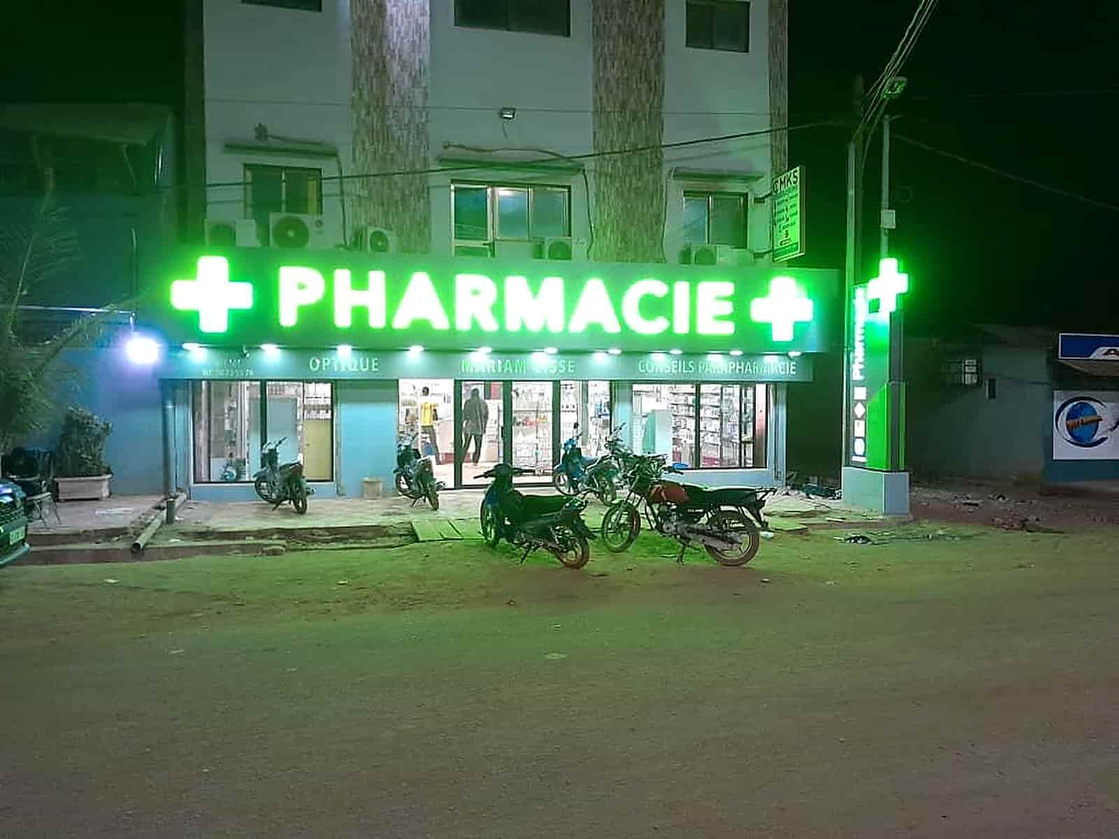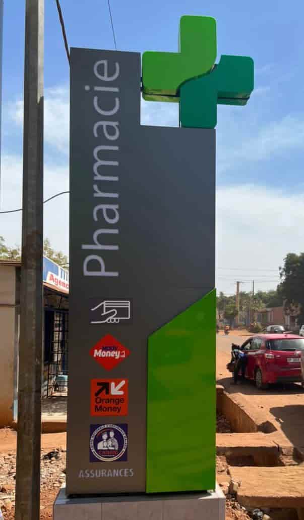 Custom illuminated pharmacy signage with LED cross symbols — night-visible branding in Bamako.