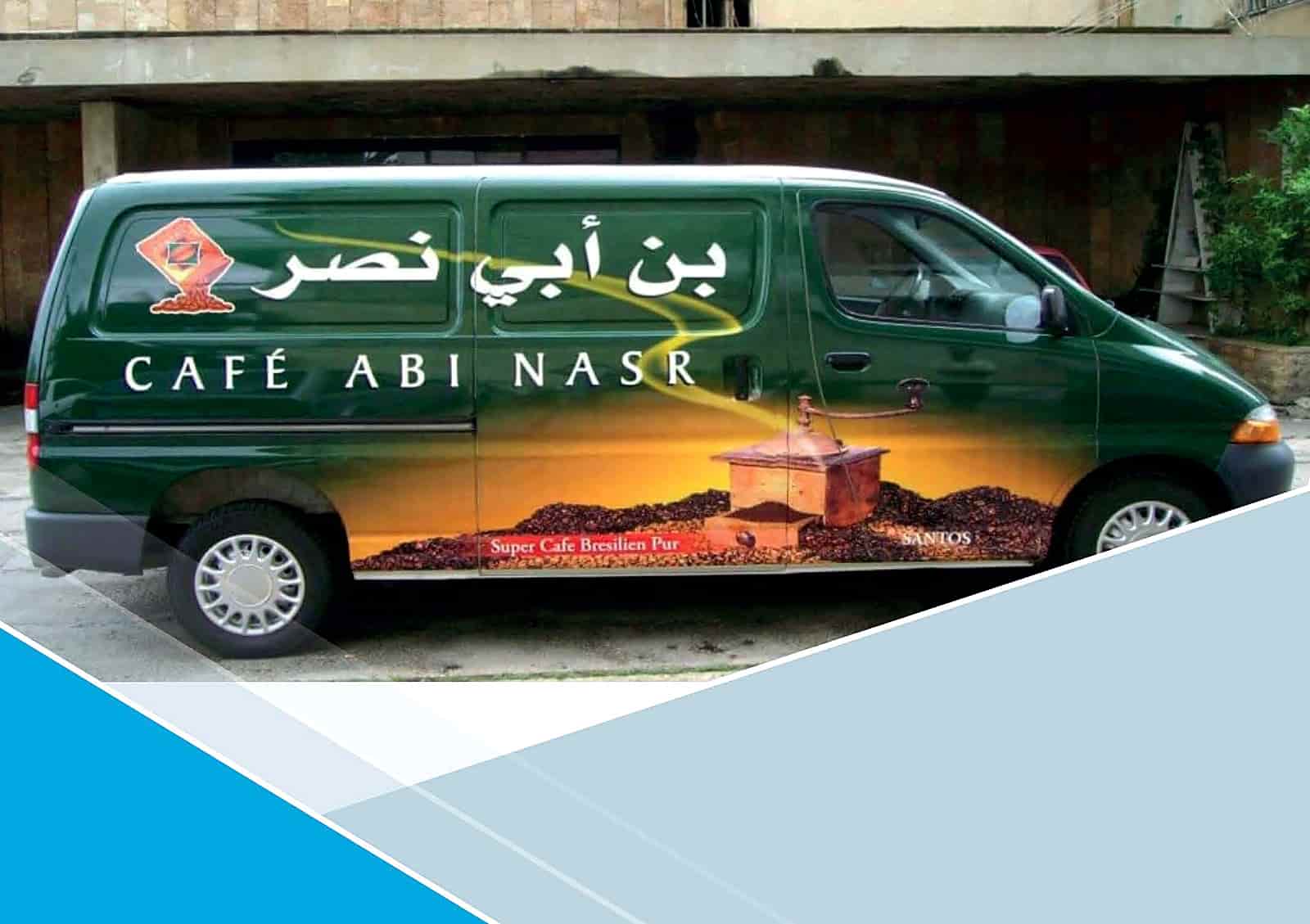 Full vehicle wrap for Café Abi Nasr delivery fleet — bold branding in Arabic and English.