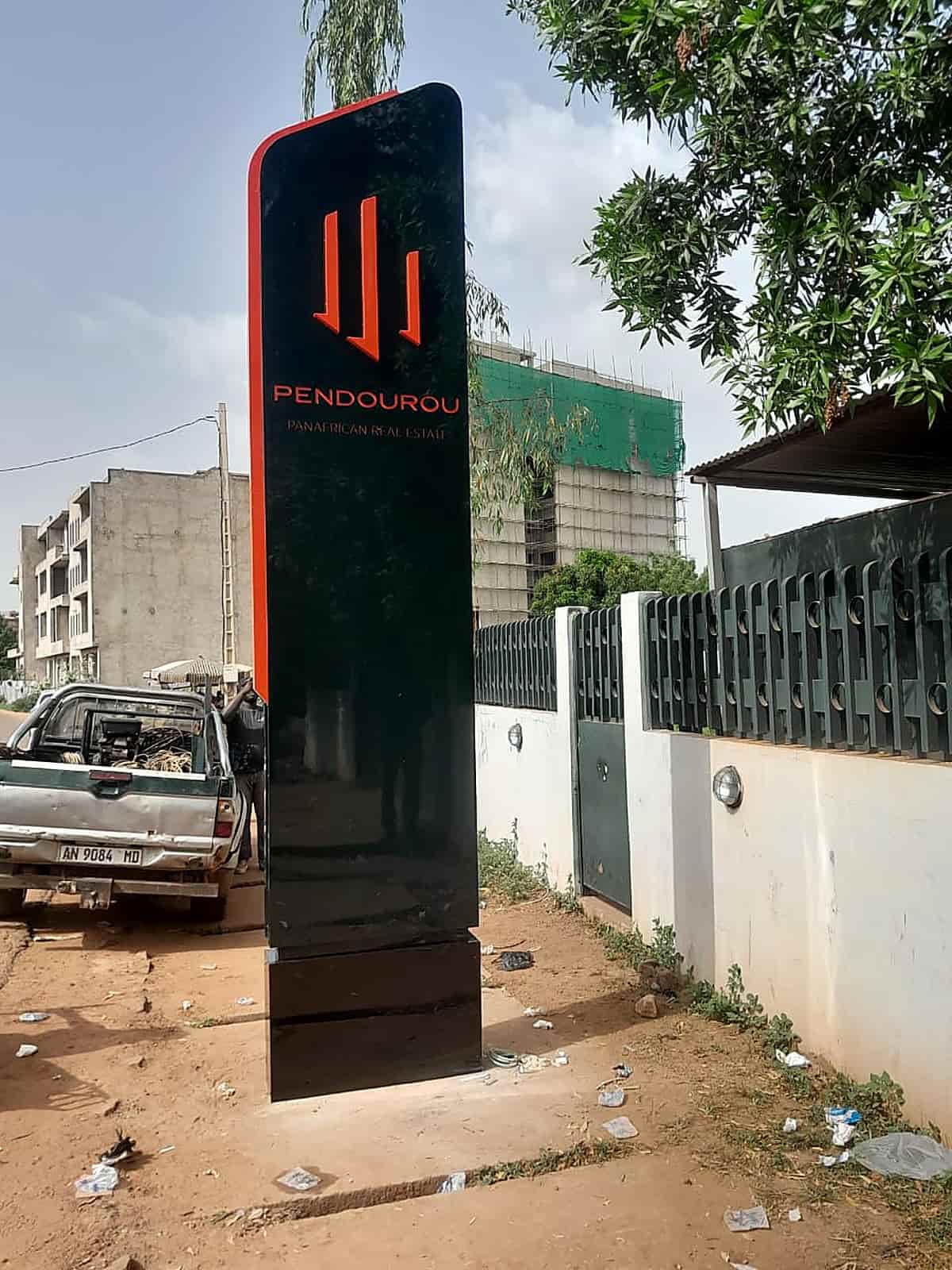 Large-scale raised 3D lettering on the Pendourou tower facade — high-rise building branding in Bamako.