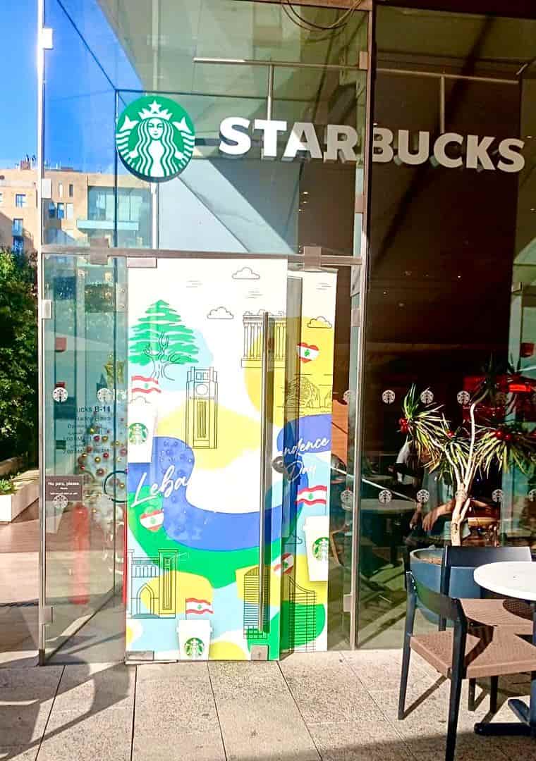 Custom storefront door vinyl for Starbucks, blending Lebanon-inspired illustration with clean brand presentation.